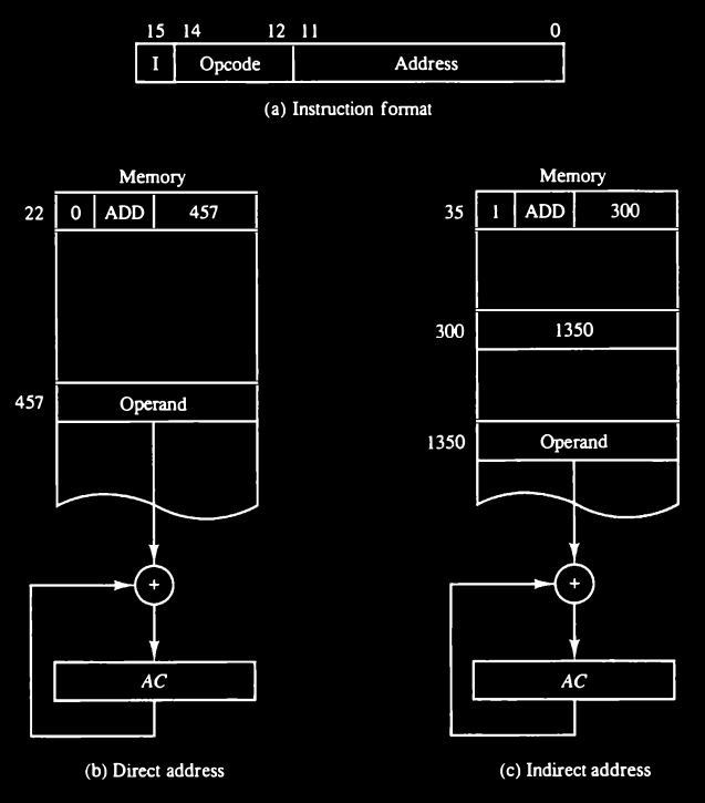 One bit of the instruction code can be used to distinguish between a direct and an indirect address. As an illustration of this configuration, consider the instruction code format shown in Fig. 1-8(a) It consists of a 3-bit operation code, a 12-bit address, and an indirect address mode bit designated by I.
